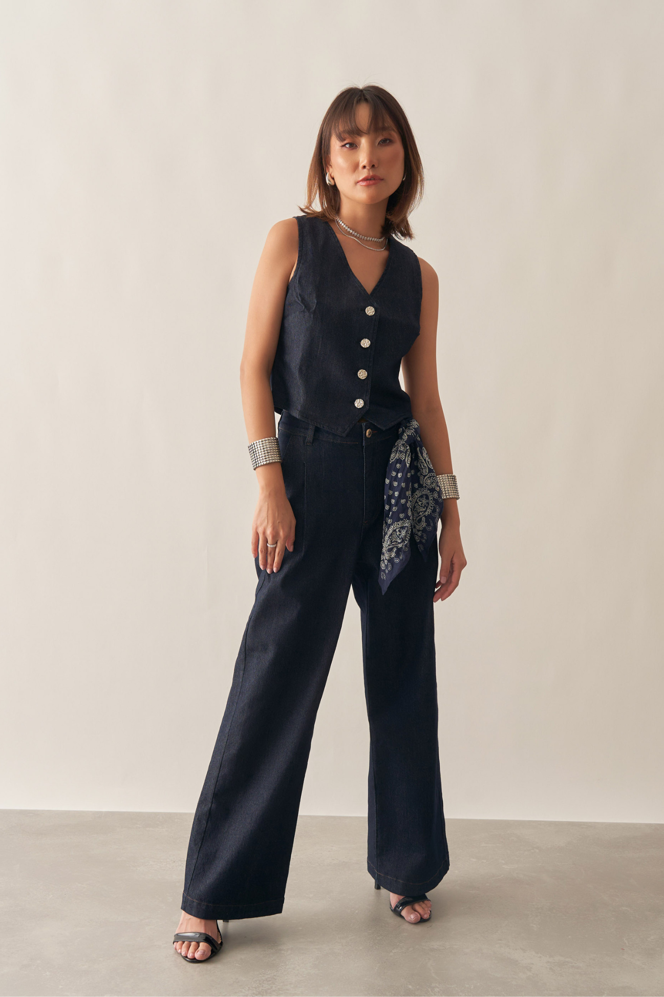 Calça em tecido denim com elastano proporciona conforto e muito estilo para você. Modelagem de pernas retas alonga a silhueta e se combinada com com o colete de mesmo tecido forma um look moderno e lindo.